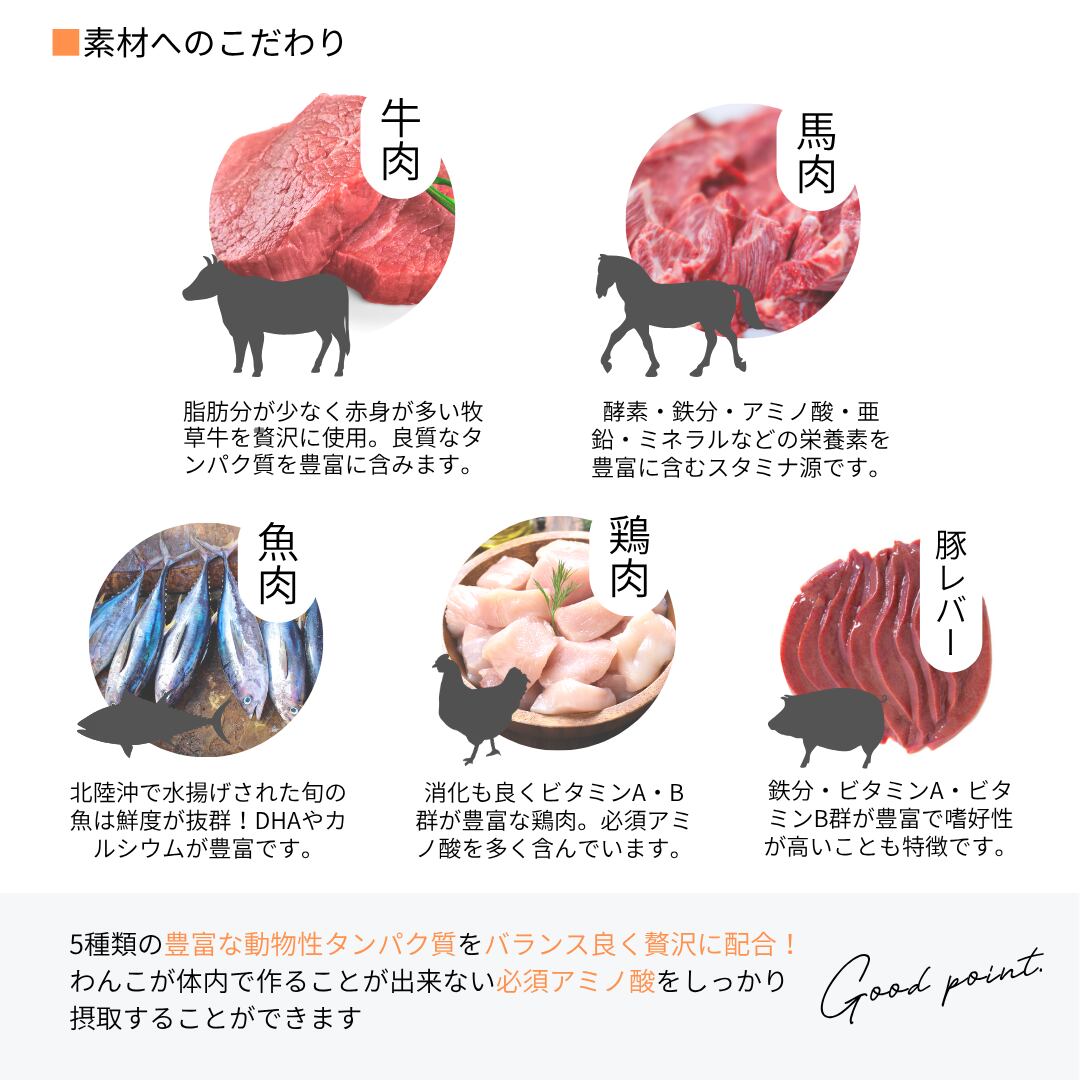 国産無添加・新鮮な5種の生肉・グルテンフリー・ノンオイルコーティング・乳酸菌・オリゴ糖配合で腸活効果!