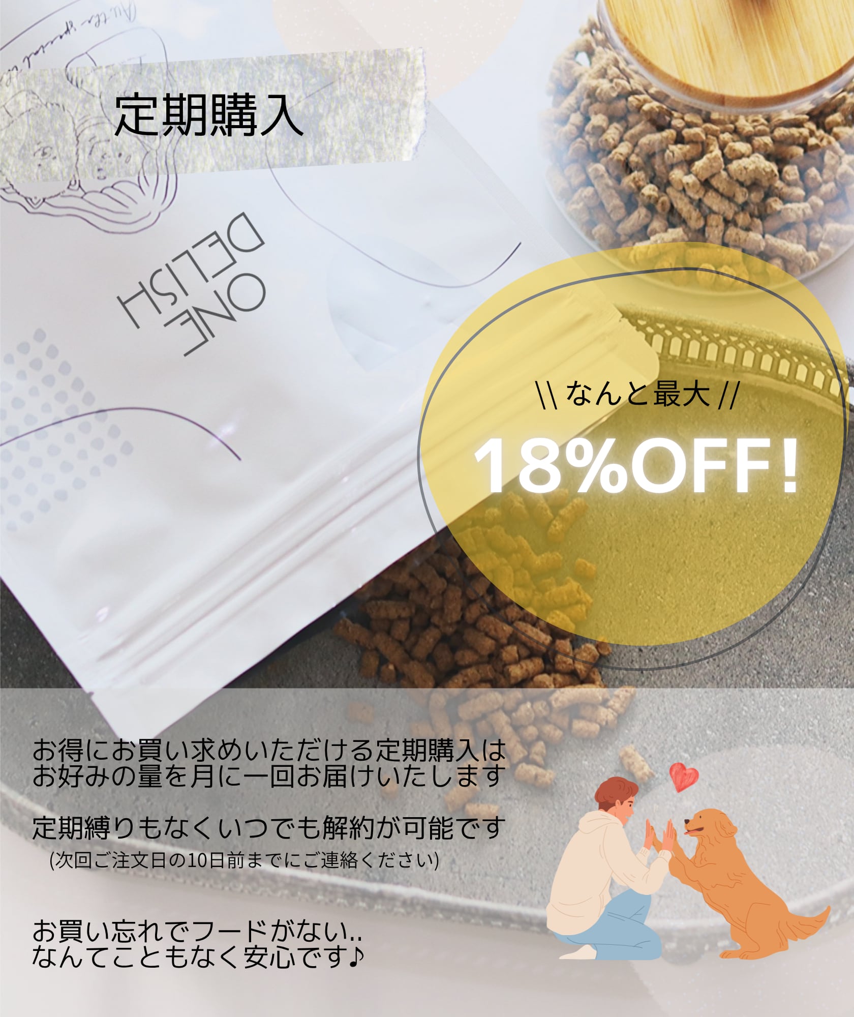 ドッグフードに使用されることが多い添加物ですが、着色料・香料・酸化防止剤・乳化剤・増粘安定剤・凝固剤・PH調整剤・保存料などがあります。またこれらは必ずしも原材料に記載されるものではないのですが、ONE DELISH はからだにやさしいものだけで作られた、安心安全なドッグフードです。