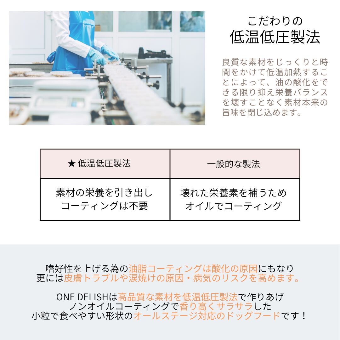 皮膚トラブルや涙焼けの原因・酸化の原因となるオイルコーティング。主に嗜好性を高めるために使用されますが、良質な素材から作られたONE DELISHはノンオイルコーティングで素材本来の美味しい香りがするので食い付きが良いのも特徴です。