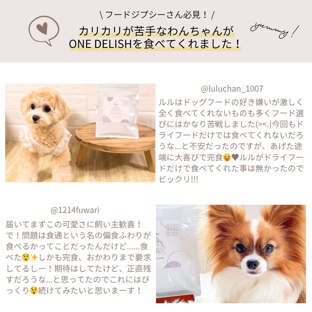 皮膚トラブルや涙焼けの原因・酸化の原因となるオイルコーティング。主に嗜好性を高めるために使用されますが、良質な素材から作られたONE DELISHはノンオイルコーティングで素材本来の美味しい香りがするので食い付きが良いのも特徴です。